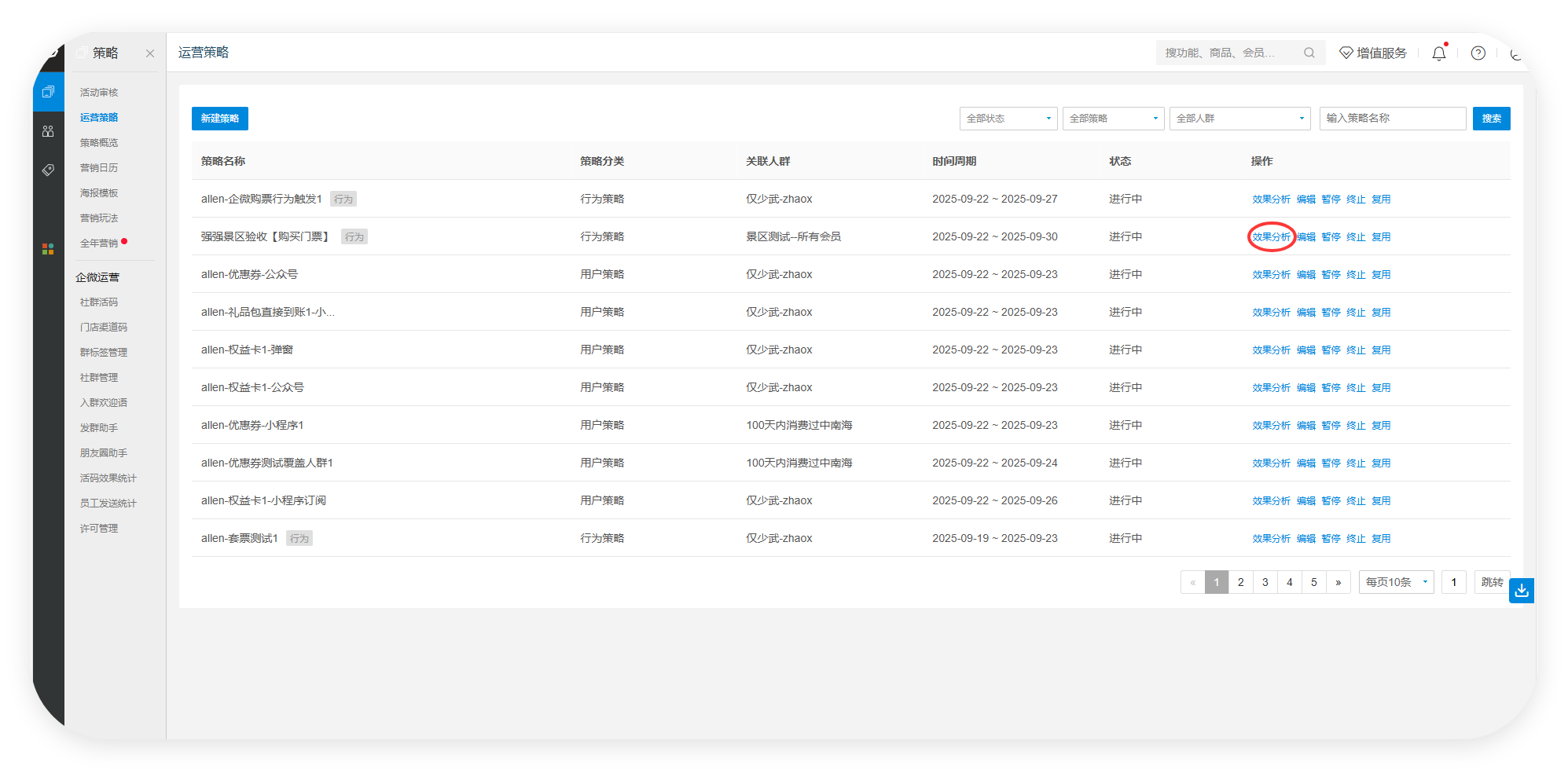 操作:在运营计划页面中,选择要查看的计划,点击操作栏【效果分析】按钮,进入查看效果分析数据。