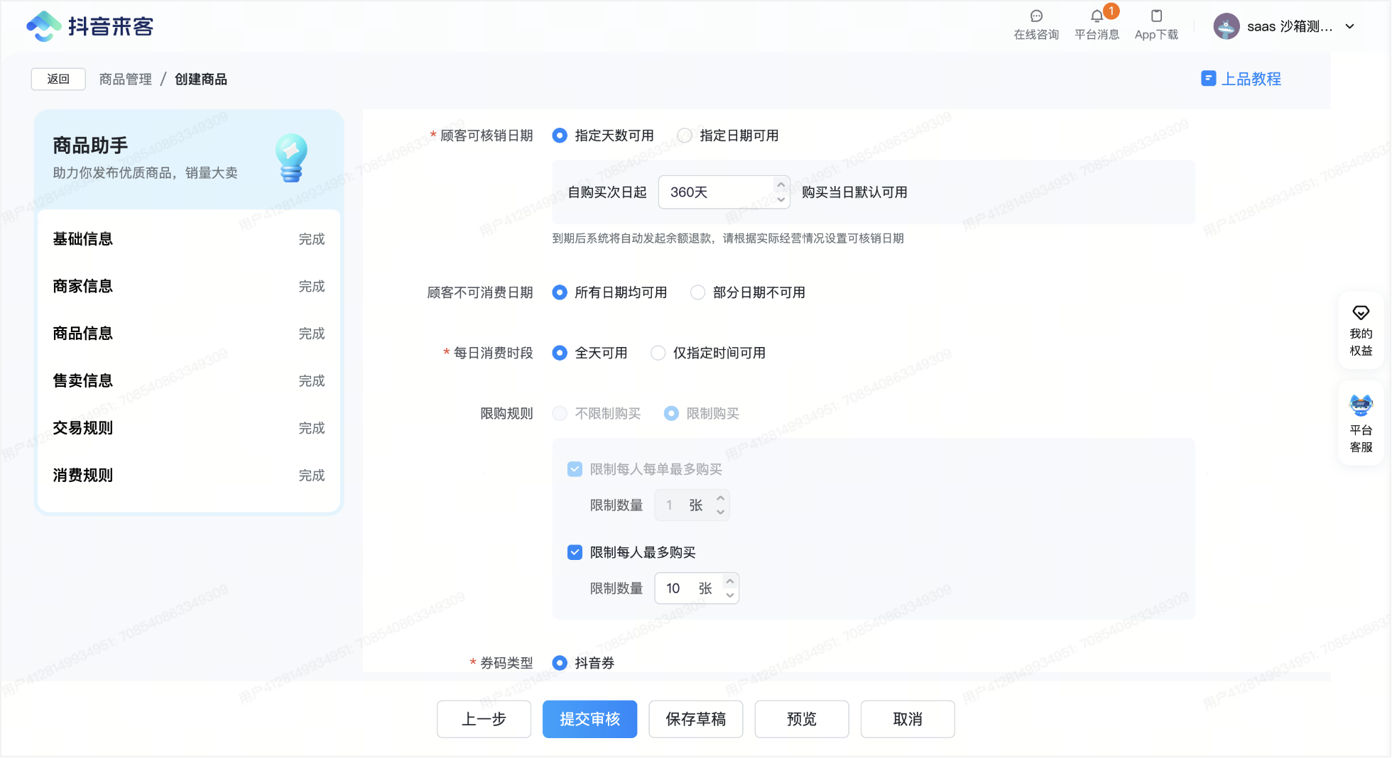 4、设置限购规则:限制每人每单最多购买 1 张,限制每人最多可购买10张。