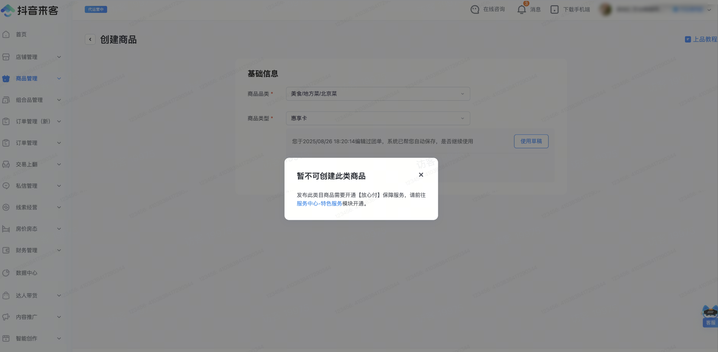 2、首次创建惠享卡商品需要开通【放心付】保障服务,根据提示点击请前往服务中心-特色服务模块开通。