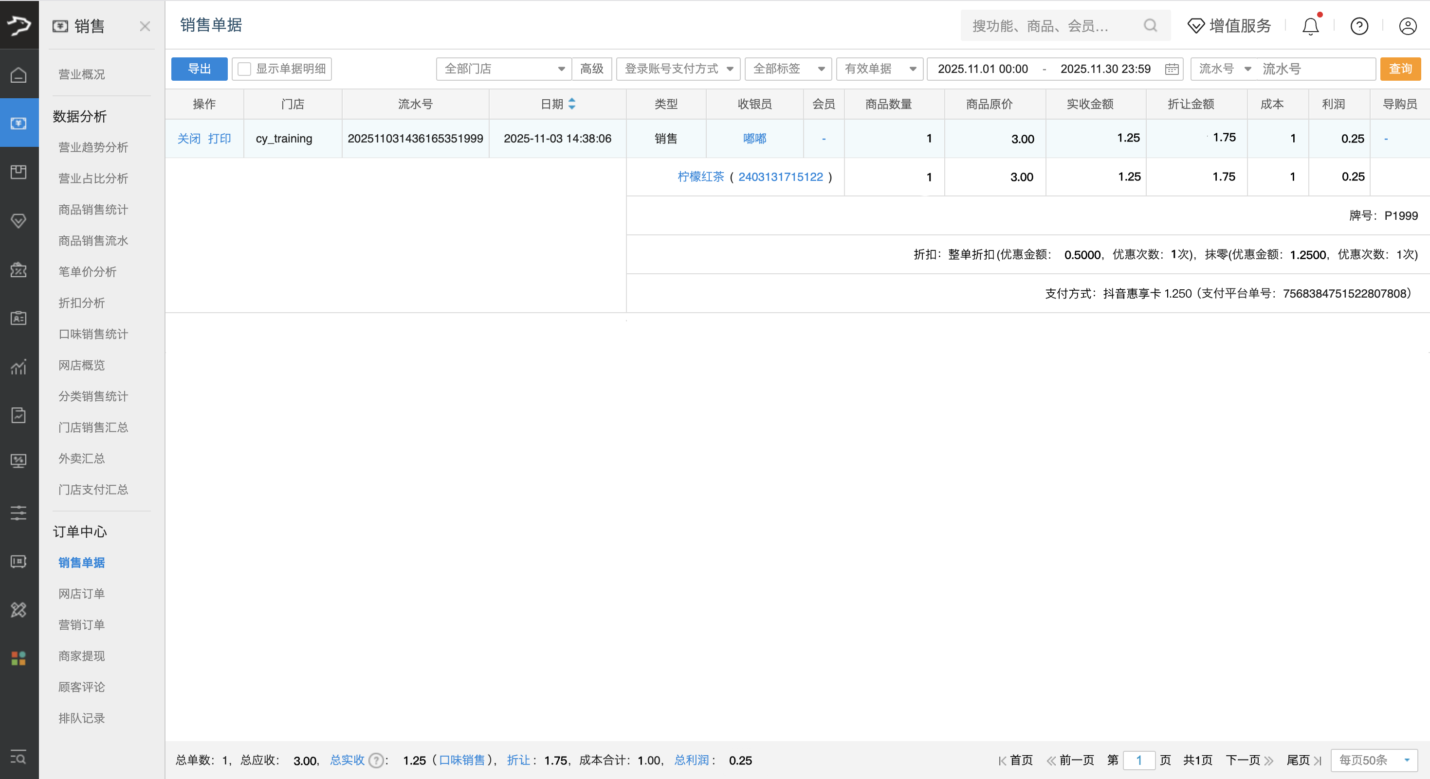 若收银员完成抖音惠享卡核销后,出现误核销、顾客退货等需撤销核销的情况,可进入银豹官网POS端「销售单据」页面,检索并找到对应核销单据,执行反结账操作即可撤销核销。