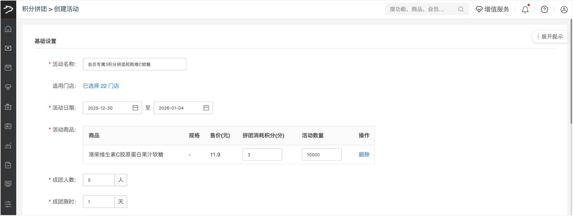 * 活动商品:添加活动商品,填写对应拼团消耗积分、活动数量