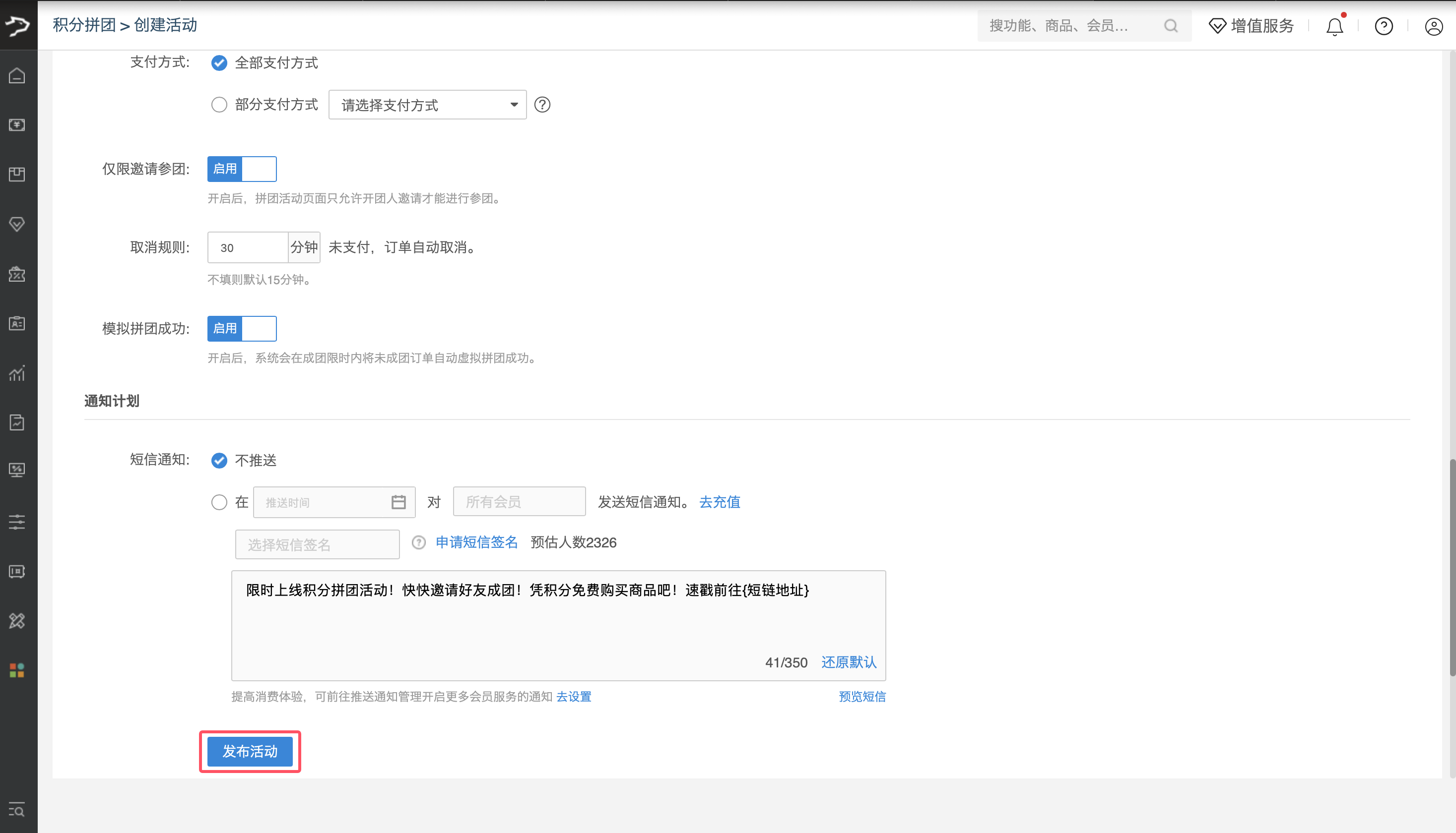 5、所有活动信息配置完成后,点击页面【发布活动】按钮,完成活动创建。