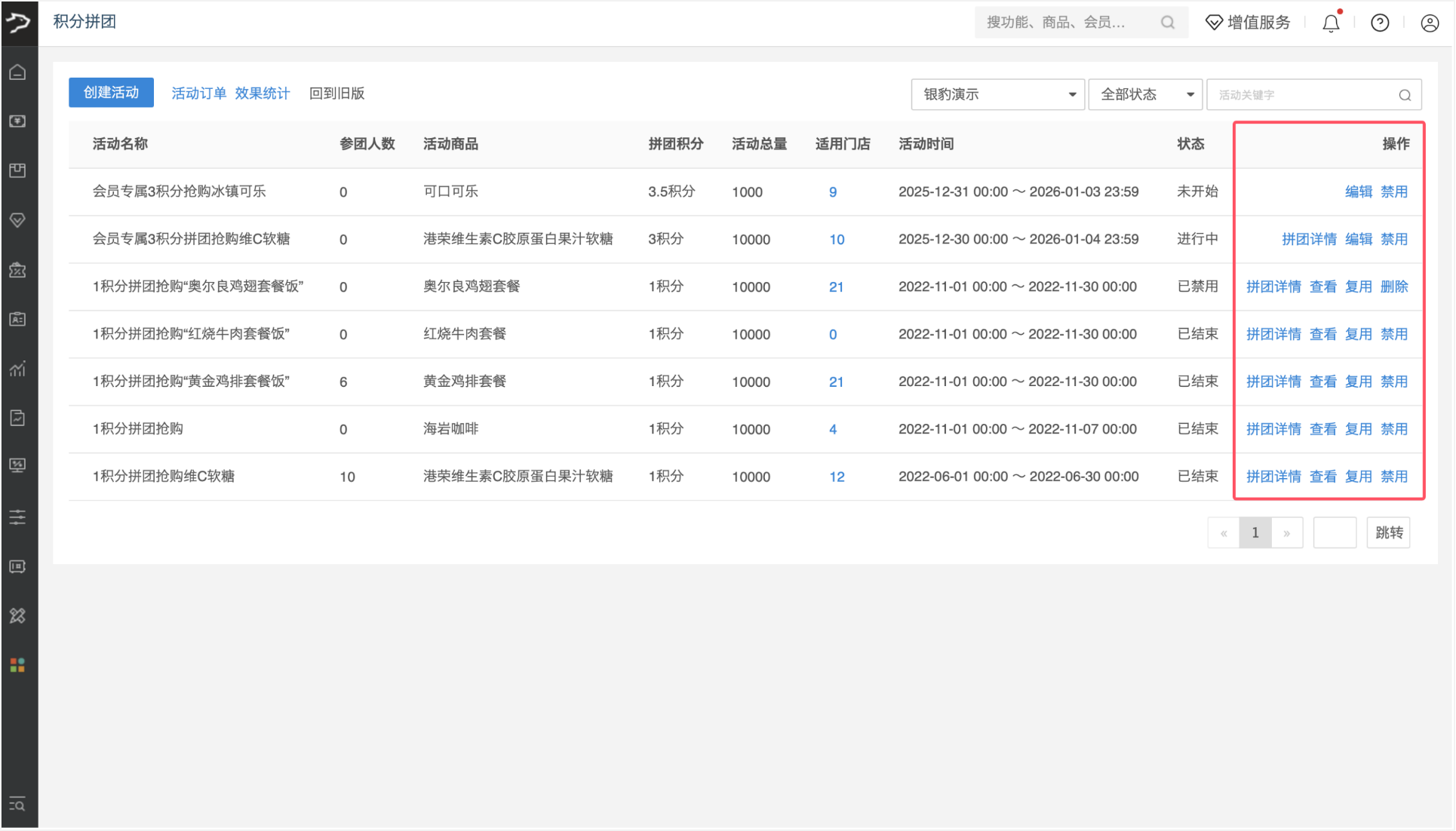 银豹官网后台,营销-工具箱-积分拼团-查看某个积分拼团活动