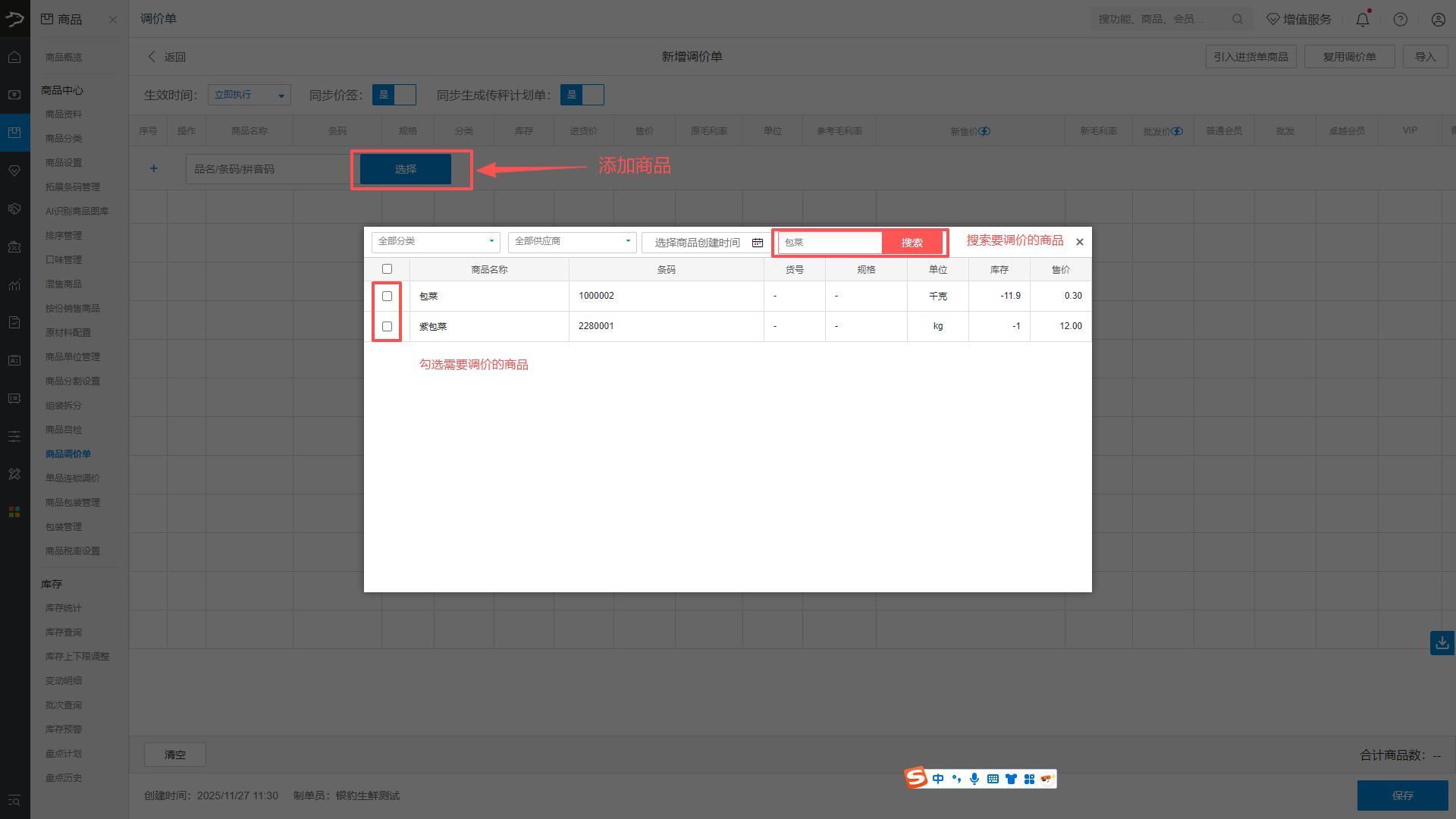 在新增调价单页面中,点击【添加】按钮,在弹窗中通过筛选商品分类、供应商、选择商品创建时间或搜索商品名称找到要添加的商品,勾选后完成添加。