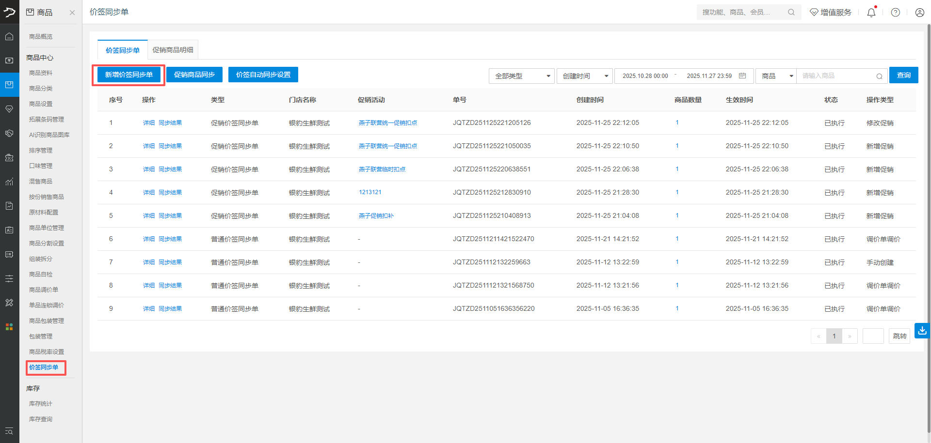 首次同步,以及后续同步价格外的信息,如产地、规格、供应商等其他字段信息,都需要通过价签同步单进行同步。