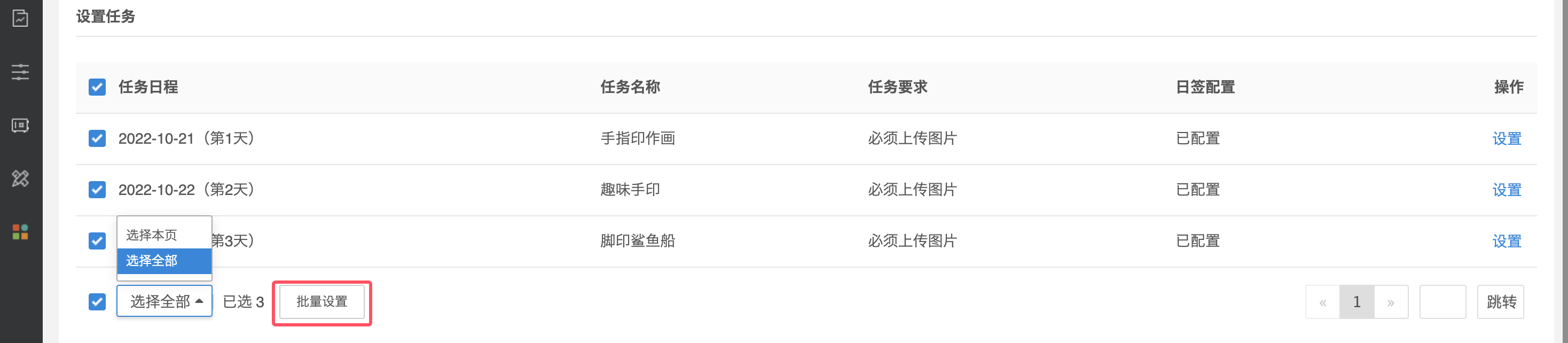 系统会根据设置的活动周期,自动生成对应天数的任务日程。您可逐一编辑设置每天的打卡任务内容,如果每天的打卡任务内容一样,也可选择批量设置。